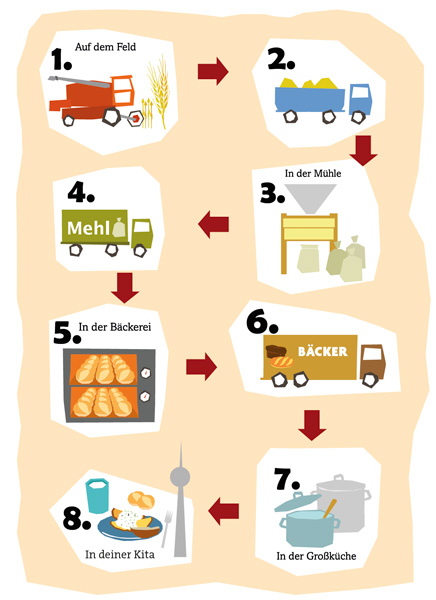 Danach wird es gewaschen, getrocknet und kann zu Mehl verarbeitet werden. Anschließend gelangt es zur Bäckerei oder in den Supermarkt.